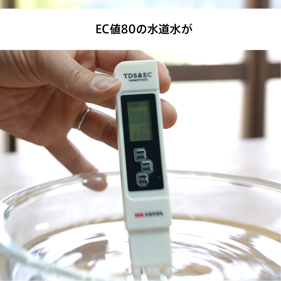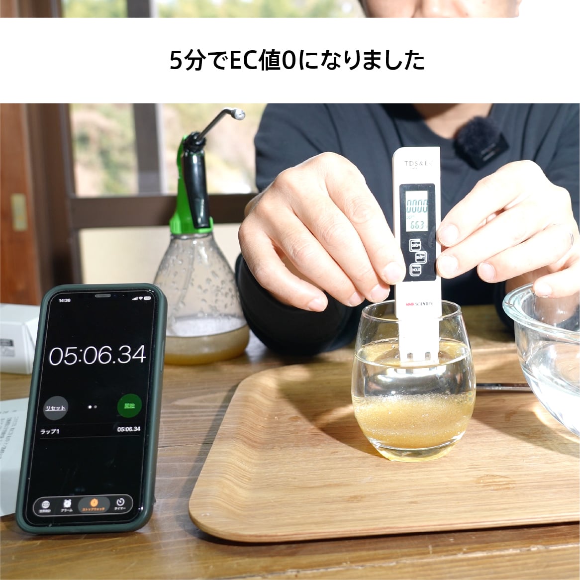 パウダーは水の中のカルキ成分やミネラル分を吸着する素材で、水道水を入れて良く振っていただくと、10分〜15分で純水に変化します。